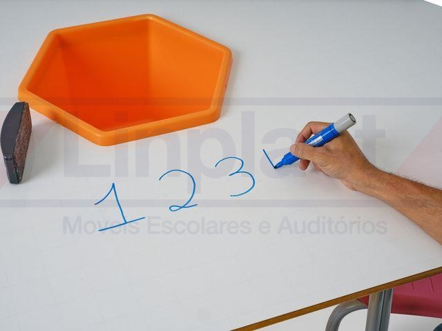 O tampo é em MDF dupla face, revestido com fórmica lousa, permitindo a escrita no próprio tampo da mesa, com acabamento das bordas em perfil PVC na cor prata.