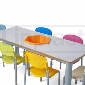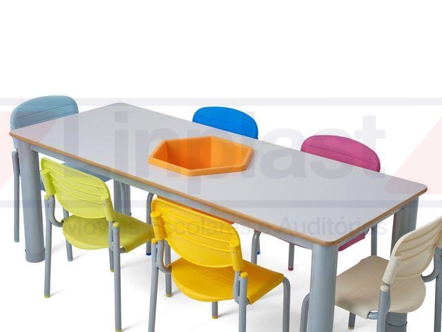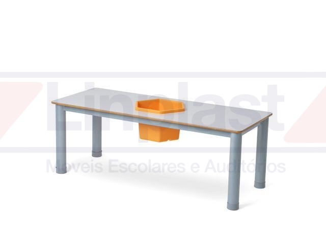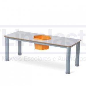 O tampo da mesa é confeccionado em MDF, revestido com fórmica em cor a escolher, com acabamento das bordas em perfil PVC, colado pelo processo hot melt. Acompanha um Balde de 22 litros encaixado no centro da mesa, ideal para guardar objetos, peças e/ou brinquedos.