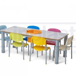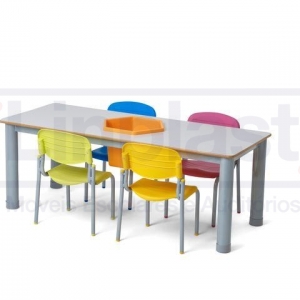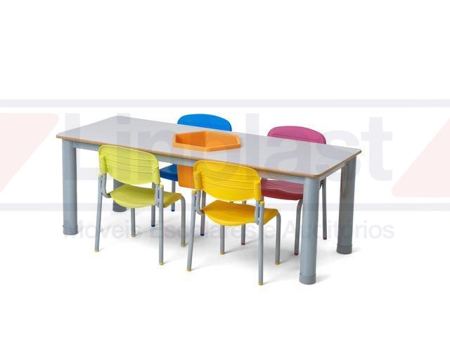 Conjunto composto por 01 (uma) mesa retangular e 06 (seis) cadeiras empilháveis.