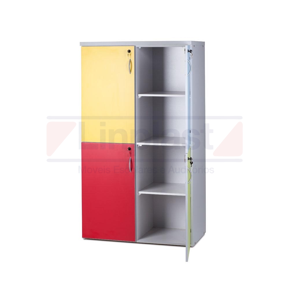 Armário quatro (04) portas confeccionado em MDF 15 mm e prateleiras em compensado cor a escolher, com revestimento das portas em fórmica colorida, acabamento das bordas em perfil PVC, chave de travamento, e uma prateleira interna. Apresentar na proposta o relatório ou laudo com ensaio comprovando a conformidade com os ensaios de acordo com as NBRS 8094,12466-1,12416-2 e NBR 14535 emitidas por laboratório acreditado pelo INMETRO. Base metalica em tubo 20 X 30 chapa 18 (1,2 mm) com 04 reguladores de nivel acoplados com rebite metálico rosca M6. Cores a escolher: (amarelo lima, kiwi, cerâmica, azul marinho, azul francês, rosa choque, vermelho e uva).