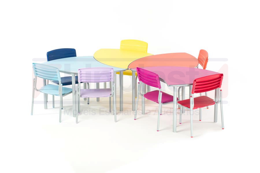 Conjunto composto por 06 cadeiras e 03 carteiras formando um círculo colorido. Estrutura metálica em tubo7/8 chapa 18 (1.2 mm) com reforço nos pés das mesas, todas unidas através de solda mig, cadeiras empilháveis acabamento em ponteiras plásticas, metal tratado contra ferrugem, pintura epóxi (a pó) na cor prata. Apresentar na proposta certificado do INMETRO da cadeira. Tampo das mesas em MDF formato gota com cantos arredondados, acabamento das bordas em perfil PVC prata, assento e encosto das cadeiras em resina plástica colorida. Cores: (amarelo lima, kiwi, cerâmica, azul marinho, azul francês, rosa choque, vermelho e uva).