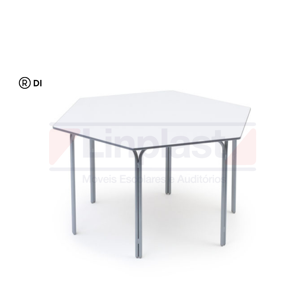Conjunto composto por uma mesa sextavada e seis cadeiras empilháveis estrutura metálica em tubo7/8 chapa 18 (1.2 mm), acabamento das terminações dos tubos das cadeiras com seis ponteiras plásticas sendo duas na parte superior e quatros nos pés, todas nas mesmas cores do assento e encosto. Estrutura metálica unidas através de solda mig, metal tratado contra ferrugem , pintura epóxi (a pó) na cor a escolher ( prata, branco ou preto). Apresentar na proposta o certificado do INMETRO da cadeira de acordo com a ABNT 14006 para mobiliário escolar. Tampo da mesa confeccionado em MDF com revestimento em fórmica cor a escolher, acabamento das bordas em perfil PVC, assento e encosto das cadeiras em resina plástica colorida. Cores do assento e encosto para escolher: amarelo lima, kiwi, azul marinho, rosa choque, vermelho, uva e bege).
