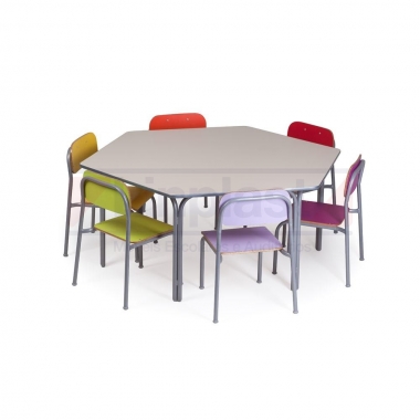Conjunto composto por 01 (uma) mesa retangular com 04 (quatro) cadeiras empilháveis. Estrutura metálica confeccionada da mesa em tubo 2 " chapa 18 (1.2 mm) e cadeira confeccionada em tubo 7/8 chapa 14 (1.9 mm) com pé traseiro em formato cônico que une-se aos pés dianteiros horizontalmente num ângulo de 51° com a finalidade de proporcionar um perfeito empilhamento, acabamento com quatro ponteiras plásticas. Metal tratado contra ferrugem pelo processo de fosfatização, pintura epóxi prata (a pó) partes metalicas unidas através de solda mig. Tampo da mesa em MDF 15 mm cinza TX, acabamento nas laterais com perfil PVC prata colado pelo sistema hot-melt. Apresentar na proposta relatório ou laudo de conformidade da cadeira com toda a ABNT 14.006/2008, emitido por laboratório credenciado ou órgão acreditado pelo INMETRO para mobiliário escolar. Assento e encosto semi-anatômico em compensado 10 mm revestido com fórmica texturizada na parte superior do assento e nas duas faces do encosto. Cores a escolher: Amarelo lima, kiwi, cerâmica, azul marinho, azul francês, rosa - choque, vermelho e uva.