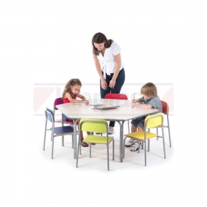 Conjunto composto por uma mesa sextavada e seis cadeiras empilháveis estrutura metálica em tubo ¾ chapa 18 (1.2 mm), todas unidas através de solda mig, metal tratado contra ferrugem pelo processo a quente em tanques com no mínimo 5 estágios. Pintura epóxi (a pó) na cor a escolher ( prata, branco ou preto). Apresentar na proposta relatório ou laudo de conformidade da cadeira com toda a ABNT 14.006/2008, emitido por laboratório credenciado ou órgão acreditado pelo INMETRO para mobiliário escolar. Tampo da mesa confeccionado em MDF com revestimento em fórmica cor a escolher, acabamento das bordas em perfil PVC, assento e encosto das cadeiras em compensado multilaminado com 10 mm semi-anatômico, revestidos em fórmica colorida na parte superior do assento e nas duas faces do encosto. Cores: (verde, amarelo lima, kiwi, azul marinho, rosa-choque, vermelho, uva e bege).