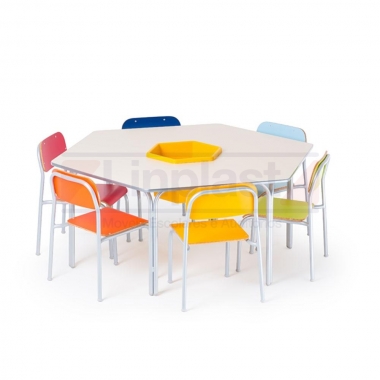 Conjunto componível, possibilitando diversas formações, composto por (06) cadeiras e três (03) mesas que unidas formão uma mesa sextavada colorida. Estrutura metálica em das cadeiras tubo 7/8 chapa 18 (1.2 mm) e mesas em 1.1/2" chapa 18 (1.2 mm), todas as partes metálicas unidas através de solda mig, cadeiras empilháveis acabamento em ponteiras plásticas, metal tratado contra ferrugem. Apresentar na proposta certificado do INMETRO da cadeira. Pintura epóxi (a pó) na cor prata. Tampo das mesas em MDF com cantos arredondados, acabamento das bordas em perfil PVC prata, assento e encosto das cadeiras em compensado multilaminado com 10 mm semi-anatômico, revestidos em fórmica colorida texturizada na parte superior do assento e nas duas faces do encosto. Cores: (amarelo lima, kiwi, cerâmica, azul marinho, azul francês, rosa choque, vermelho e uva).