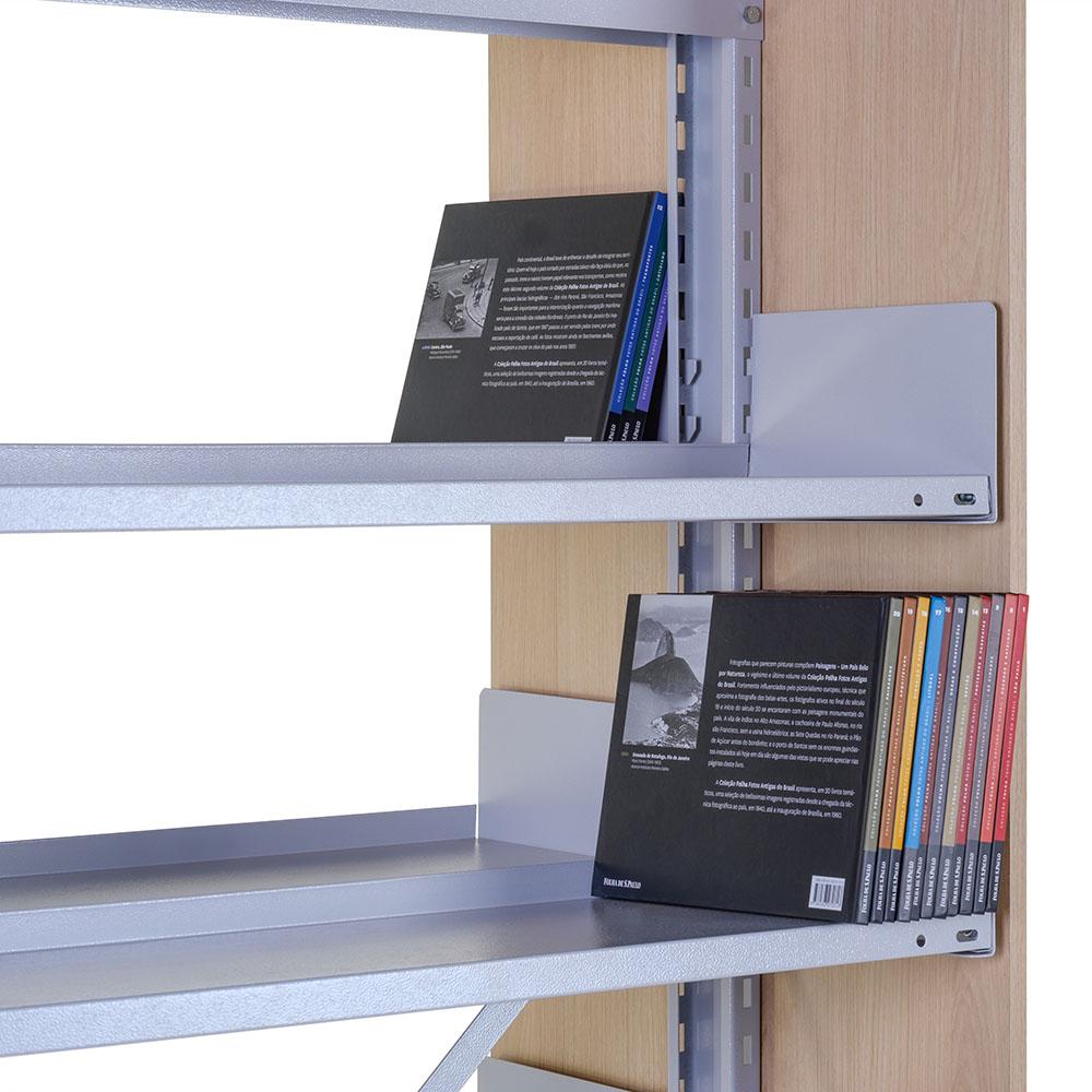 Estante em aço para biblioteca modelo dupla face premium, com reforço em "X" e nos pés para nivelamento e segurança, confeccionadas em chapa 14 (coluna) e bandejas com chapa 24 mm, metal tratado contra ferrugem e pintura epóxi (a pó) na cor cinza (12 prateleiras). Apresentar na proposta o relatório ou laudo comprovando a conformidade com os ensaios de acordo com as NBRS 8094,12466-1,12416-2 e NBR 14535 emitidas por laboratório acreditado pelo INMETRO. Acabamento nas laterais em MDF ou compensado revestido nas duas faces, cores a escolher.