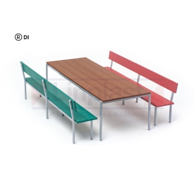 Conjunto composto de seis (06) cadeiras e duas (02) carteiras formando um círculo. Estrutura metálica das cadeiras tubo ¾ chapa 18 (1.2 mm) e mesas em 1.1/2" chapa 18 (1.2 mm), todas as partes metálicas unidas através de solda mig, cadeiras empilháveis acabamento em ponteiras plásticas, metal tratado contra ferrugem. Apresentar na proposta relatório ou laudo de conformidade da cadeira com toda a ABNT 14.006/2008, emitido por laboratório credenciado ou órgão acreditado pelo INMETRO para mobiliário escolar. Pintura epóxi (a pó) na cor prata. Tampo das mesas em MDF com cantos arredondados, corte convexo unindo-se perfeitamente as carteiras com acabamento das bordas em perfil PVC prata, assento e encosto das cadeiras em compensado multilaminado com 10 mm semi-anatômico, revestidos em fórmica colorida texturizada na parte superior do assento e nas duas faces do encosto. Cores: (amarelo lima, kiwi, cerâmica, azul marinho, azul francês, rosa choque, vermelho e uva).