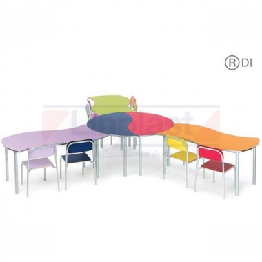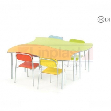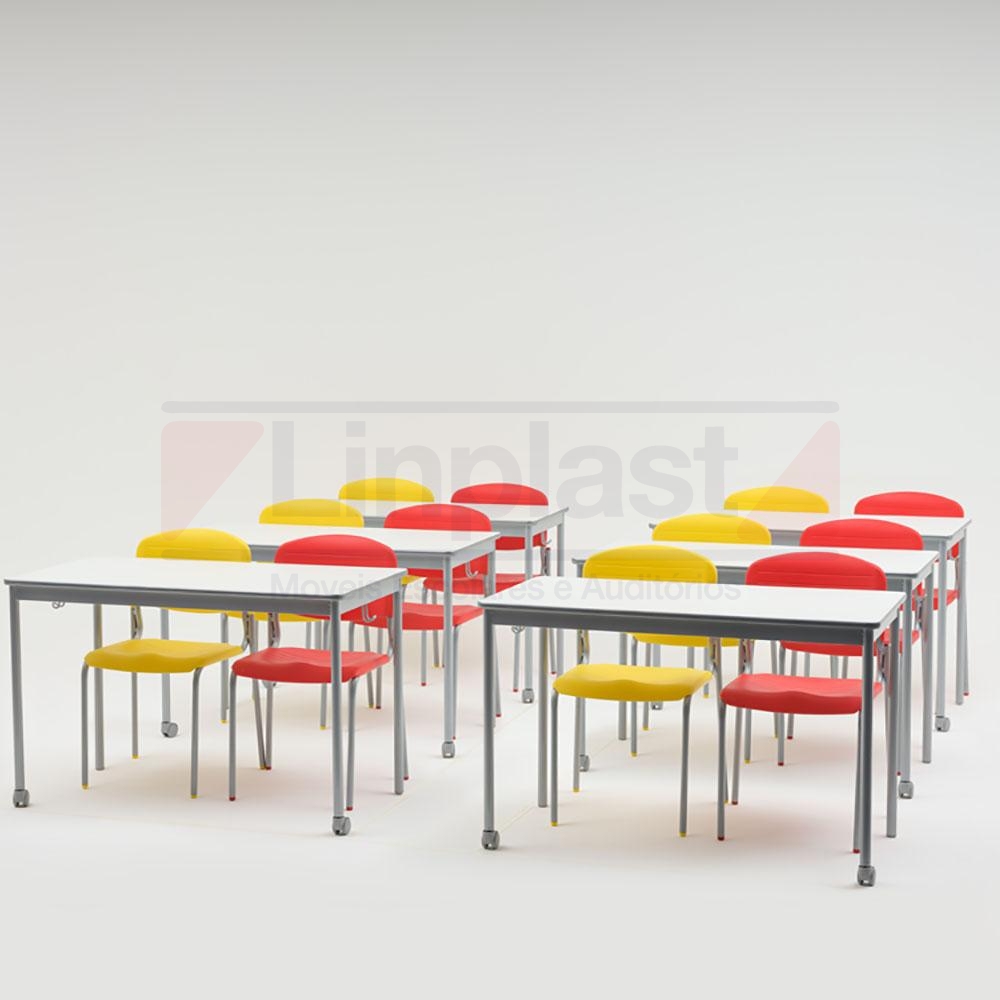 Estrutura metálica da mesa em 1.1/2" chapa 16 (1.5 mm), todas as partes metálicas unidas através de solda mig, metal com tratamento contra ferrugem. Pintura epóxi (a pó) na cor prata. Tampo das mesas em MDF com cantos arredondados, acabamento das bordas em perfil PVC prata revestidos em fórmica colorida texturizada. Com suporte para mochila em aço trefilado redondo 1/4’’ e com dois rodízios 50 mm de diâmetro e com capa protetora para os rodízios. Cores: (amarelo lima, kiwi, cerâmica, azul marinho, azul francês, rosa choque, vermelho e uva).