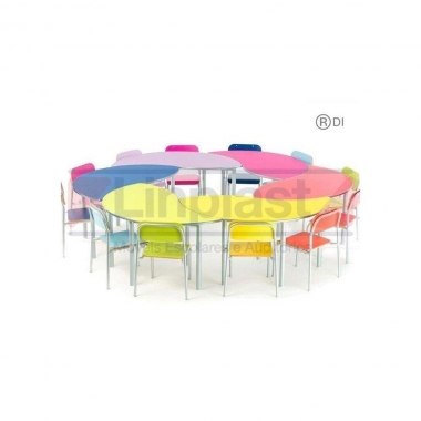 Conjunto circular juvenill formado por seis ou cinco mesas e seis ou cinco cadeiras.