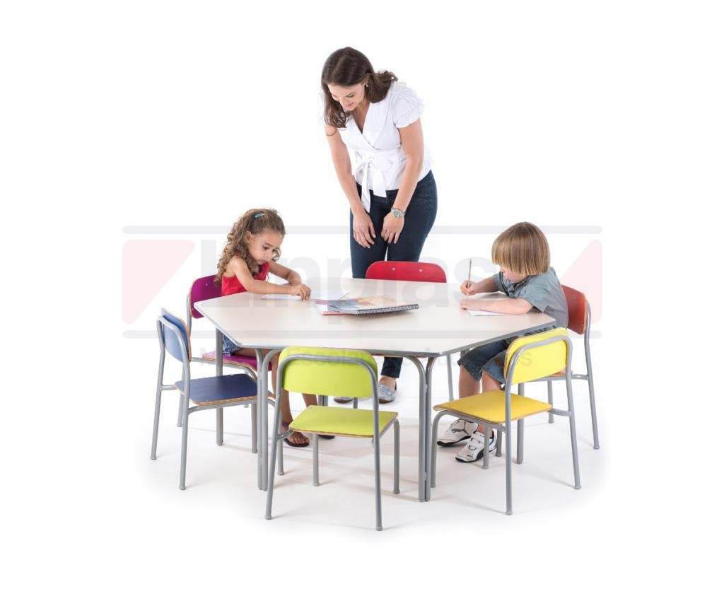 Conjunto composto por uma mesa sextavada e seis cadeiras empilháveis estrutura metálica em tubo ¾ chapa 18 (1.2 mm), todas unidas através de solda mig, metal com tratamento contra ferrugem pelo processo a quente em tanques com no mínimo 5 estágios, pintura epóxi (a pó) na cor a escolher ( prata, branco ou preto). Apresentar na proposta relatório ou laudo de conformidade da cadeira com toda a ABNT 14.006/2008, emitido por laboratório credenciado ou órgão acreditado pelo INMETRO para mobiliário escolar. Tampo da mesa confeccionado em MDF com revestimento em fórmica cor a escolher, acabamento das bordas em perfil PVC, assento e encosto das cadeiras em compensado multilaminado com 10 mm semi-anatômico, revestidos em fórmica colorida na parte superior do assento e nas duas faces do encosto. Cores: (verde, amarelo lima, kiwi, azul marinho, rosa-choque, vermelho, uva e bege).