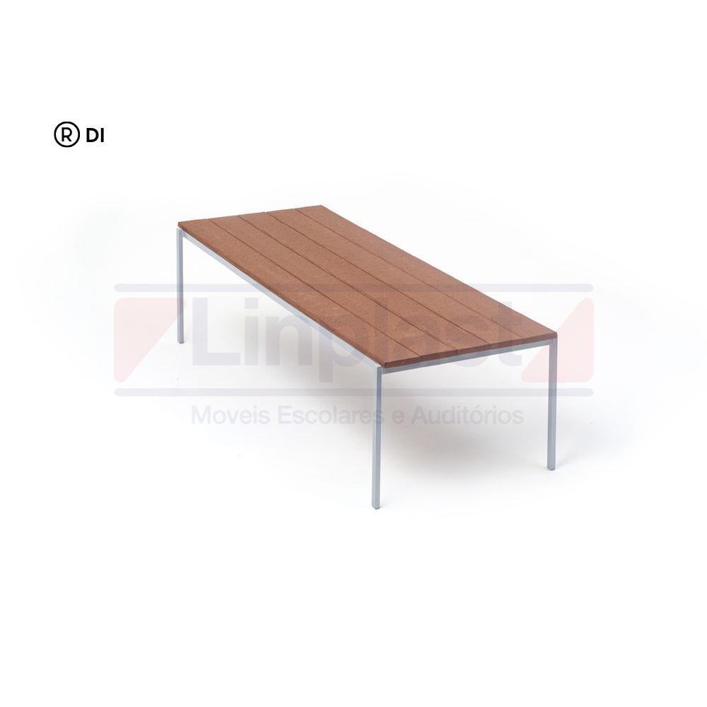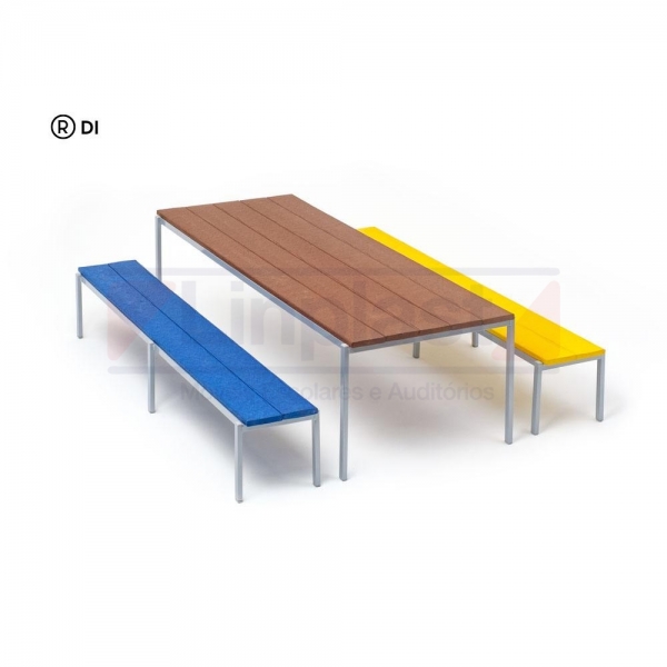 Conjunto composto por 01 mesa empilhável e 02 bancos , estrutura metálica confeccionada em tubo 20 x 30 chapa 18 (1.2 mm) metal tratados contra ferrugem, solda mig, pintura epóxi (a pó) cor a escolher (prata, preto ou branco) acabamento com ponteiras de plástico resistente, tampo da mesa e dos bancos em MADEIRA ECOLÓGICA resitentes a àgua, POSSIBILITANDO USO EXTERNO E INTERNO. Cores a escolher.