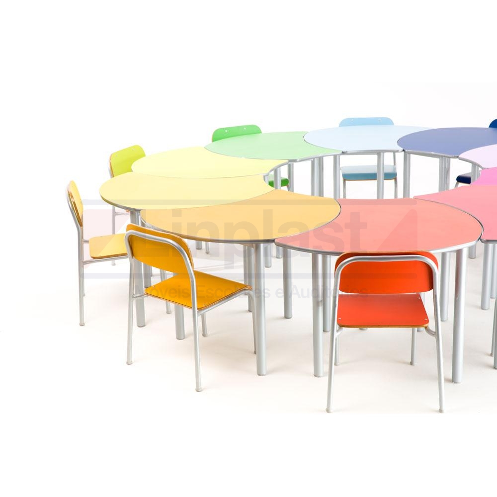 Conjunto carteiras e cadeira. Estrutura metálica das cadeiras tubo 7/8 chapa 18 (1.2 mm) e mesas em 1.1/2" chapa 18 (1.2 mm), todas as partes metálicas unidas através de solda mig, cadeira empilhávei acabamento em ponteiras plásticas, metal tratado contra ferrugem, pintura epóxi (a pó) na cor prata. Apresentar na proposta o certificado do INMETRO da cadeira. Tampo das mesas em MDF revestidos com fórmica texturizada, acabamento com perfil PVC prata, Estrutura metálica das cadeiras e mesas em tubo 7/8 chapa 18 (1.2 mm) todas as partes metálicas unidas através de solda mig, cadeiras empilháveis com assento e encosto das cadeiras em resina plástica colorida, acabamento das terminações dos tubos com seis ponteiras, duas na parte superior e quatro nos pés, todas coloridas com as mesmas cores dos assentos e encostos, metal com tratamento contra ferrugem. Cores: (amarelo lima, kiwi, cerâmica, azul marinho, azul francês, rosa choque, vermelho e uva).