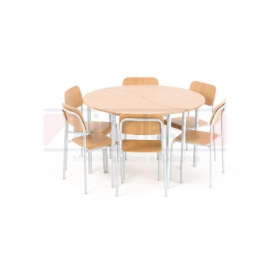 Conjunto componível, permite várias formações, conjunto composto por oito (08) cadeiras e cinco (05) mesas. Estrutura metálica em das cadeiras empilháveis tubo ¾ chapa 18 (1.2 mm) e mesas em 1.1/2" chapa 18 (1.2 mm), todas as partes metálicas unidas através de solda mig, cadeiras empilháveis acabamento em ponteiras plásticas, metal com tratamento contra ferrugem, pintura epóxi (a pó) na cor prata. Apresentar na proposta o certificado do INMETRO da cadeira. Tampo das mesas em MDF revestido com fórmica colorida texturizada com cantos arredondados, acabamento das bordas em perfil PVC prata, assento e encosto das cadeiras em compensado multilâminado com 10 mm semi-anatômico, revestidos em fórmica colorida texturizada na parte superior do assento e nas duas faces do encosto. Cores: Marfim, Freijó e Carvalho.