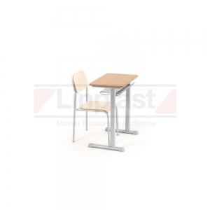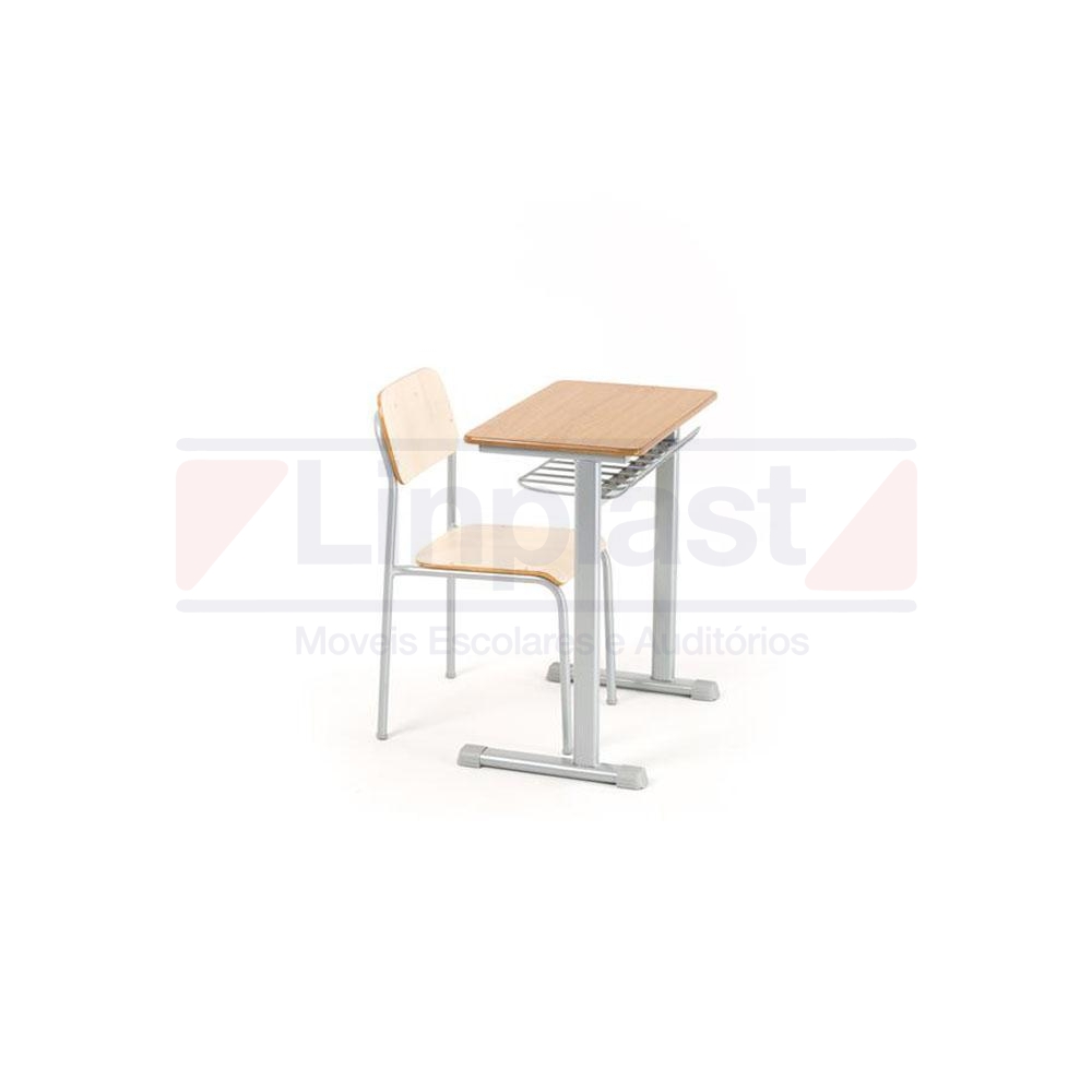 Conjunto composto por uma cadeira empilhável e uma carteira, estrutura metálica da carteira confeccionada em tubo 29 x 58 chapa 16 (1.5 mm) gradil porta-livro abaixo do tampo em ferro maciço seção quadrada. Tampo em MDF usinado 180° sem cantos vivos (borda à prova de vandalismo), revestido em fórmica texturizada 0,8 mm cor a escolher, acabamento nas laterais em verniz. Apresentar na proposta relatório ou laudo de conformidade da cadeira com toda a ABNT 14.006/2008, emitido por laboratório credenciado ou órgão acreditado pelo INMETRO para mobiliário escolar. Cadeira em tubo 7/8 chapa 16 (1.5 mm) metal tratado contra ferrugem, pintura epóxi (a pó) de cor a escolher (prata ou preto), solda mig, acabamento em ponteiras resistente. Assento e encosto da cadeira confeccionado em compensado semi-anatômico 10 mm, revestidos em fórmica texturizada 0,8 mm na parte superior do assento e nas duas faces do encosto, fixados a estrutura metálica através de rebites de alumínio. Cores da fórmica a escolher: Marfim, Freijó e Carvalho.