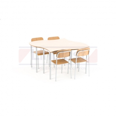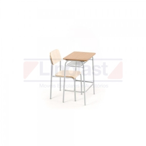 Conjunto composto por uma carteira com travessa “U” para reforço, ligando as quatro pernas e uma cadeira, estrutura metálica confeccionada em tubo 7/8 chapa 18 (1.2 mm), metal tratado contra ferrugem, pintura epóxi (a pó) de cor preta ou prata, solda mig. Apresentar na proposta o certificado do INMETRO de acordo com a ABNT 14006 para mobiliário escolar. Acabamentos em ponteiras, tampo em MDF usinado 180° sem cantos vivos, revestido em fórmica texturizada ou brilhante 0.8 mm cor a escolher, acabamento nas laterais em selador envernizado (à prova de vandalismo), gradil porta-livros em ferro maciço abaixo do tampo seção quadrada, assento e encosto da cadeira empilhável confeccionado em compensado 10 mm semi-anatômico revestido em fórmica texturizada ou brilhate 0.8 mm fixados a estrutura metálica através de rebites de alumínio. Cores da fórmica a escolher: (verde, amarelo lima, kiwi, cerâmica, azul marinho, azul francês, rosa choque, vermelho, uva e bege).