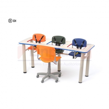Conjunto composto por 01 (uma) mesa e com 04 (quatro) cadeiras empilháveis, estrutura metálica confeccionada da mesa em tubo 2 " chapa 18 (1.2 mm) e cadeira confeccionada em tubo 7/8 chapa 14 (1.9 mm) com pé traseiro em formato cônico que une-se aos pés dianteiros horizontalmente num ângulo de 51° com a finalidade de proporcionar um perfeito empilhamento, acabamento com quatro ponteiras plásticas. Metal tratado contra ferrugem pelo processo de fosfatização, pintura epóxi prata (a pó) partes metalicas unidas através de solda mig. Tampo da mesa em MDF 15 mm cinza TX, acabamento nas laterais com perfil PVC prata colado pelo sistema hot-melt. Apresentar na proposta relatório ou laudo de conformidade da cadeira com toda a ABNT 14.006/2008, emitido por laboratório credenciado ou órgão acreditado pelo INMETRO para mobiliário escolar. Assento e encosto semi-anatômico em compensado 10 mm revestido com fórmica texturizada na parte superior do assento e nas duas faces do encosto. Cores a escolher: Amarelo lima, kiwi, cerâmica, azul marinho, azul francês, rosa choque, vermelho e uva.