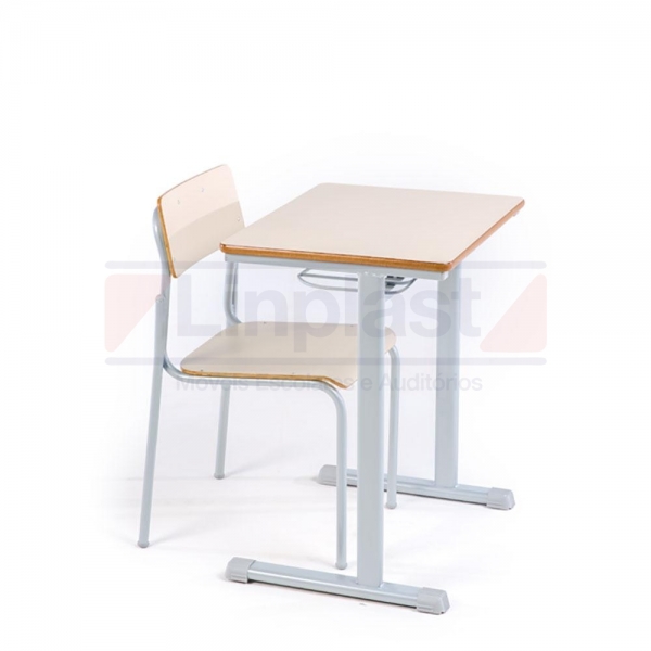 Conjunto composto por uma cadeira empilhável e uma carteira, estrutura metálica da carteira confeccionada em tubo 29 x 58 chapa 16 (1.5 mm) gradil porta-livro abaixo do tampo em ferro maciço seção quadrada. Tampo em MDF usinado 180° sem cantos vivos (borda à prova de vandalismo), revestido em fórmica texturizada 0,8 mm cor a escolher, acabamento nas laterais em verniz. Apresentar na proposta relatório ou laudo de conformidade da cadeira com toda a ABNT 14.006/2008, emitido por laboratório credenciado ou órgão acreditado pelo INMETRO para mobiliário escolar. Cadeira em tubo 7/8 chapa 16 (1.5 mm) metal tratado contra ferrugem, pintura epóxi (a pó) de cor a escolher (prata ou preto), solda mig, acabamento em ponteiras resistente. Assento e encosto da cadeira confeccionado em compensado semi-anatômico 10 mm, revestidos em fórmica texturizada 0,8 mm na parte superior do assento e nas duas faces do encosto, fixados a estrutura metálica através de rebites de alumínio. Cores da fórmica a escolher: Marfim, Freijó e Carvalho.