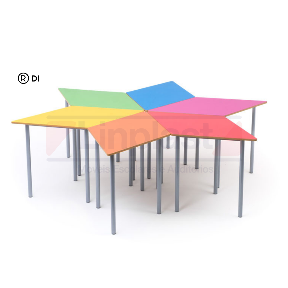 Conjunto componível, possibilitando diversas formações, composto de (06) cadeiras e três (03) mesas que unidas formão uma mesa sextavada colorida. Estrutura metálica em das cadeiras tubo 7/8 chapa 18 (1.2 mm) e mesas em 1.1/2" chapa 18 (1.2 mm), todas as partes metálicas unidas através de solda mig, cadeiras empilháveis acabamento em ponteiras plásticas, metal com tratamento contra ferrugem. Apresentar na proposta certificado do INMETRO da cadeira. Pintura epóxi (a pó) na cor prata. Tampo das mesas em MDF com cantos arredondados, acabamento das bordas em perfil PVC prata, assento e encosto das cadeiras em resina plástica colorida texturizada. Cores: (amarelo lima, kiwi, cerâmica, azul marinho, azul francês, rosa choque, vermelho e uva).