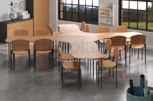 Conjunto adulto componível, permite várias formações composto por oito (16) cadeiras e cinco (06) mesas. Estrutura metálica em das cadeiras tubo 7/8 chapa 18 (1.2 mm) e mesas em 1.1/2" chapa 18 (1.2 mm) todas as partes metálicas unidas através de solda mig, cadeiras empilháveis com acabamento em ponteiras plásticas, metal com tratamento contra ferrugem, pintura epóxi (a pó) na cor prata. Apresentar na proposta o certificado do INMETRO da cadeira. Tampo das mesas em MDF revestido com fórmica colorida texturizada com cantos arredondados, assento e encosto das cadeiras em resina plástica colorida. Cores: (amarelo lima, kiwi, cerâmica, azul marinho, azul francês, rosa choque, vermelho e uva).
