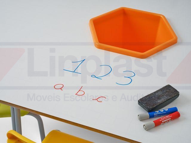 O tampo é em MDF dupla face, revestido com fórmica lousa, permitindo a escrita no próprio tampo da mesa, com acabamento das bordas em perfil PVC na cor prata.