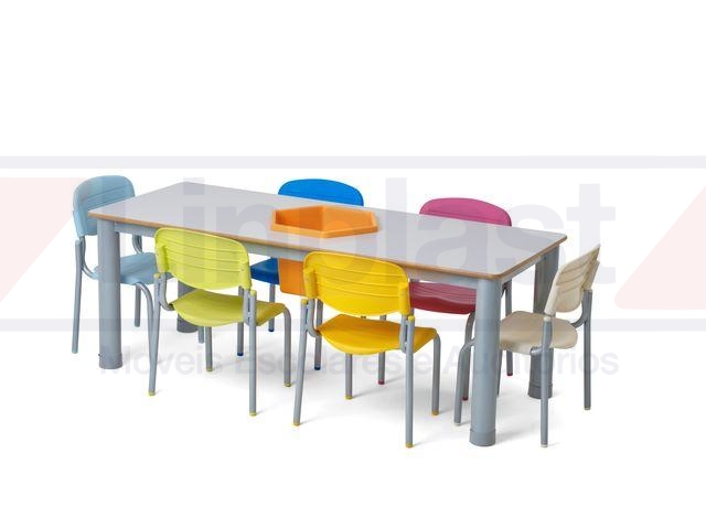 Conjunto composto por 01 (uma) mesa retangular e 06 (seis) cadeiras empilháveis.