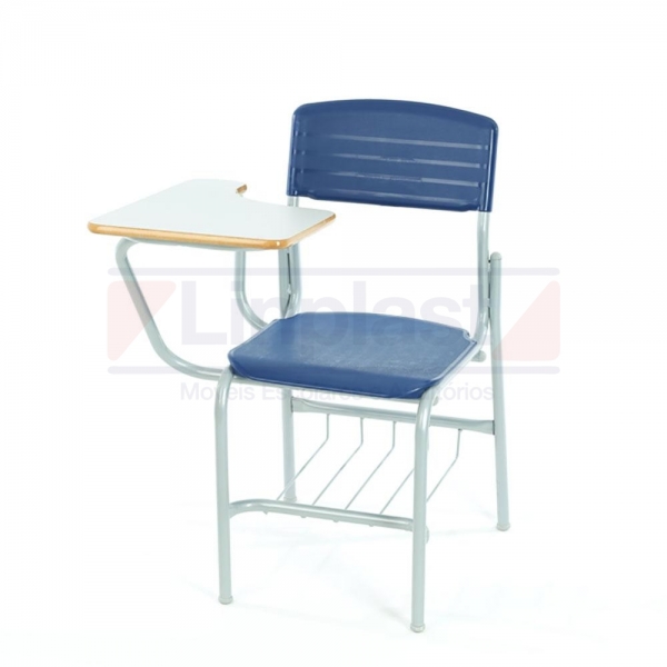 Estrutura metálica confeccionada em tubo 7/8 chapa 18 (1.2 mm), metal tratado contra ferrugem, pintura epóxi (a pó) cor prata ou preta, gradil porta-livros abaixo do assento com recuo, todas as partes metálicas unidas por solda mig, acabamento com ponteiras resistentes. Prancheta em MDF usinada 180° sem cantos vivos, revestida em fórmica lisa brilhante ou texturizada, acabamento nas laterais em verniz  (borda com verniz à prova de vandalismo), assento e encosto das cadeiras plástico virgem colorido, cores a escolher.